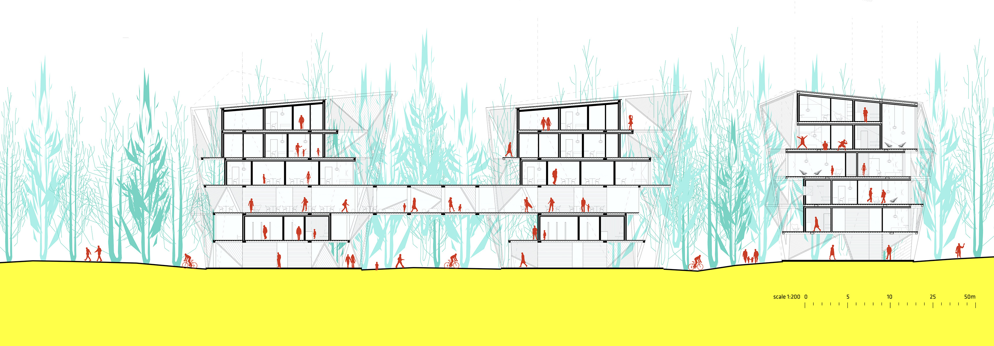 The office’s project approaches an architectural program for students and faculty at Aalto University’s campus in Otaniemi, with the particular difficulty of its insertion in woodlands bordering a EU’s protected Natura 2000 site. The jury highlighted the proposal’s sensitivity for minimizing its footprint on site, as well as its expressive construction, and the adaptability it provides to the relation between inhabitants and surrounding nature.